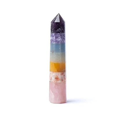 Ein Regenbogen‑Obelisk aus Amethyst, Lepidolith, Angelit, grünem Aventurin, gelbem Aventurin, Sonnenstein und Rosenquarz wirkt wie eine aufsteigende Säule aus reiner Chakrenkraft. Jede Steinschicht trägt ihre eigene Frequenz und verbindet sich im Obelisken zu einem harmonischen Energiefeld, das Klarheit, Herzöffnung, Mut, Ausgleich und innere Stabilität vereint.